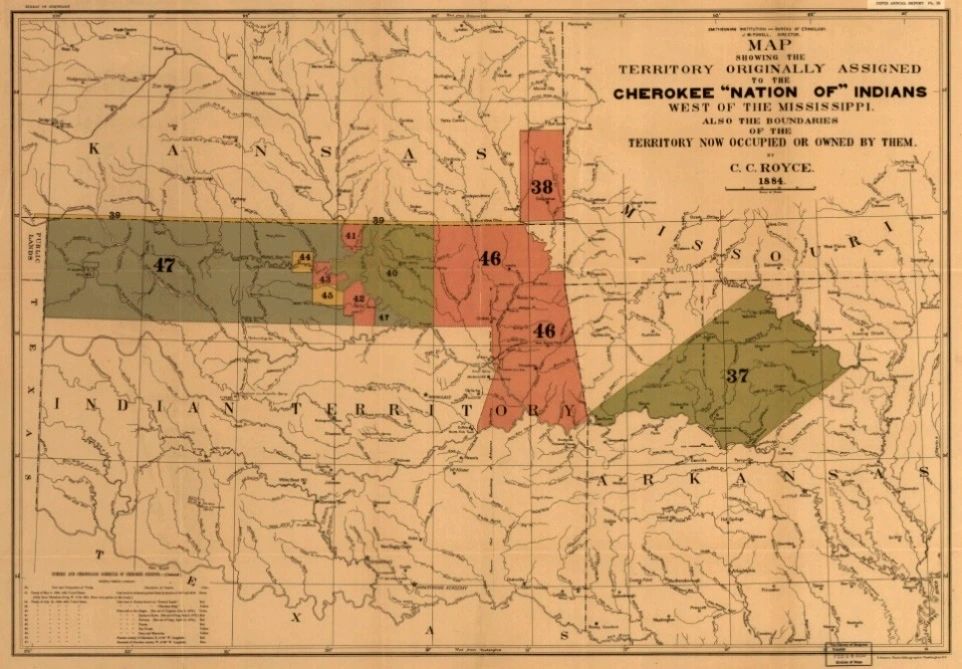 "Map showing the territory originally assigned Cherokee ′Nation of′ Indians′′, i.e., after the forcible relocation known as the ′′Trail of Tears”